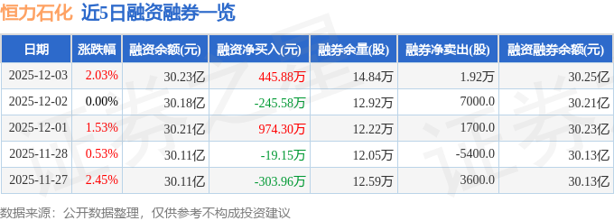 恒力石化融资融券信息数据显现,融资方面,当日融资买入3831.35万元,融资归还3385.47万元,融资净买入445.88万元。融券方面,融券卖出2.63万股,融券归还7100.0股,融券余量14.84万股,融券余额290.72万元。融资融券余额30.25亿元。